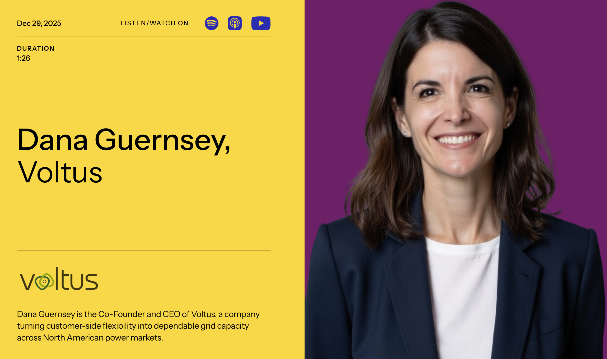 Read moreDec 29, 2025Watt it Takes: Voltus Co-Founder and CEO Dana Guernsey“We started leaning into complexity as a strength. The rules change, customers change, markets change, and instead of fighting that we decided to design for it. We wanted adaptability to be our superpower.”